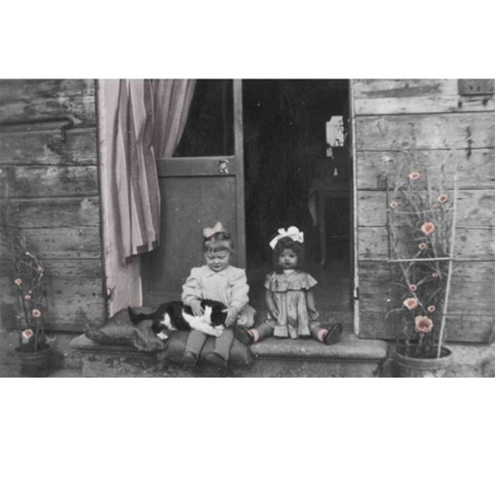 Quadro con gatto, bimba e bambola 25 x 35 cm