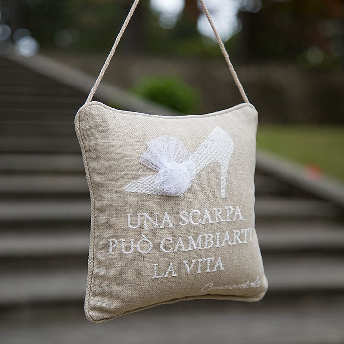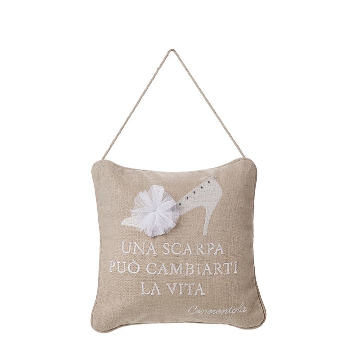 Cuscino ricamato "una scarpa puo' cambiarti..." 20 x 20 cm