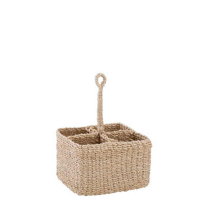 Cesto in abaca naturale, handmade. l'abaca è un materiale 100% vegetale, ricavato dalla pianta musa textilis. È quindi 100% naturale, ecologico e biodegradabile. cestino prezioso e raffinato. prodotto multifunzionale : grazie ai suoi 4 scomparti, è ideale come portaposate o comunque per contenere e dividere i materiali vari. facile da trasportare grazie al manico centrale con impugnatura ad anello. si può pulire con una spugna umida oppure con uno smacchiatore a secco. disponibile in 3 colori: bianco, lino e nero , e in due misure : 16*16 cm o 21*21 cm.