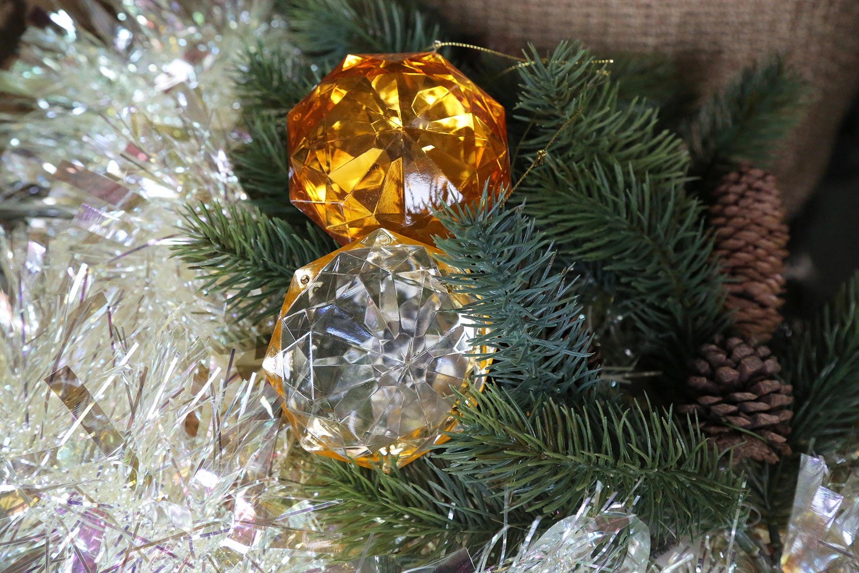 Decoro pensile che misura 9 cm di diametro in metacrilato, materiale plastico pratico e resistente, di colore argento brillante, già pronto per essere appeso grazie ad un sottile cordino dorato. la forma del decoro gioiello è ottagonale e le due facce convesse si presentano sfaccettate creando dei giochi scintillanti di luce e ombra. questi decori si caratterizzano per avere un aspetto affascinante e prezioso. molto decorativi sugli alberi di natale, ma anche su tende, porte e finestre. possono essere un'idea originale e nuova da regalare durante le feste di natale.