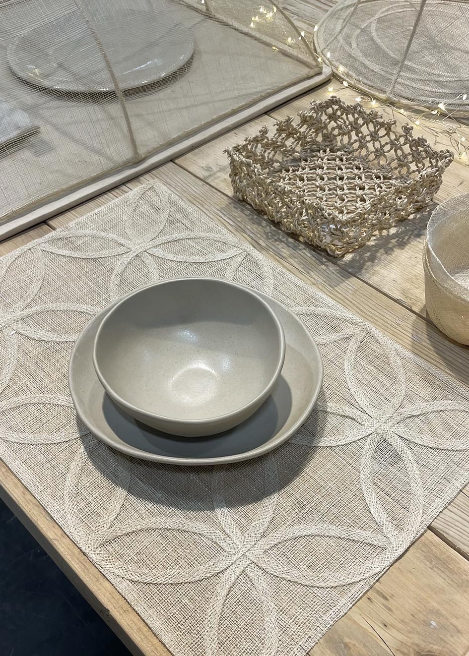 Tovaglietta 33 x 48 cm in abaca naturale, handmade. prezioso e raffinato motivo a petali. si può pulire con una spugna umida oppure con uno smacchiatore a secco. la pianta dell'abaca è originaria delle filippine, ma in passato la sua coltura è stata introdotta anche nel sud-est asiatico e nell'america latina. la specie migliore da cui ricavare fibre è musa textilis, una sorta di banano. l'abaca è adoperata per tele, tessuti e cordame estremamente flessibili, leggeri e resistenti.
