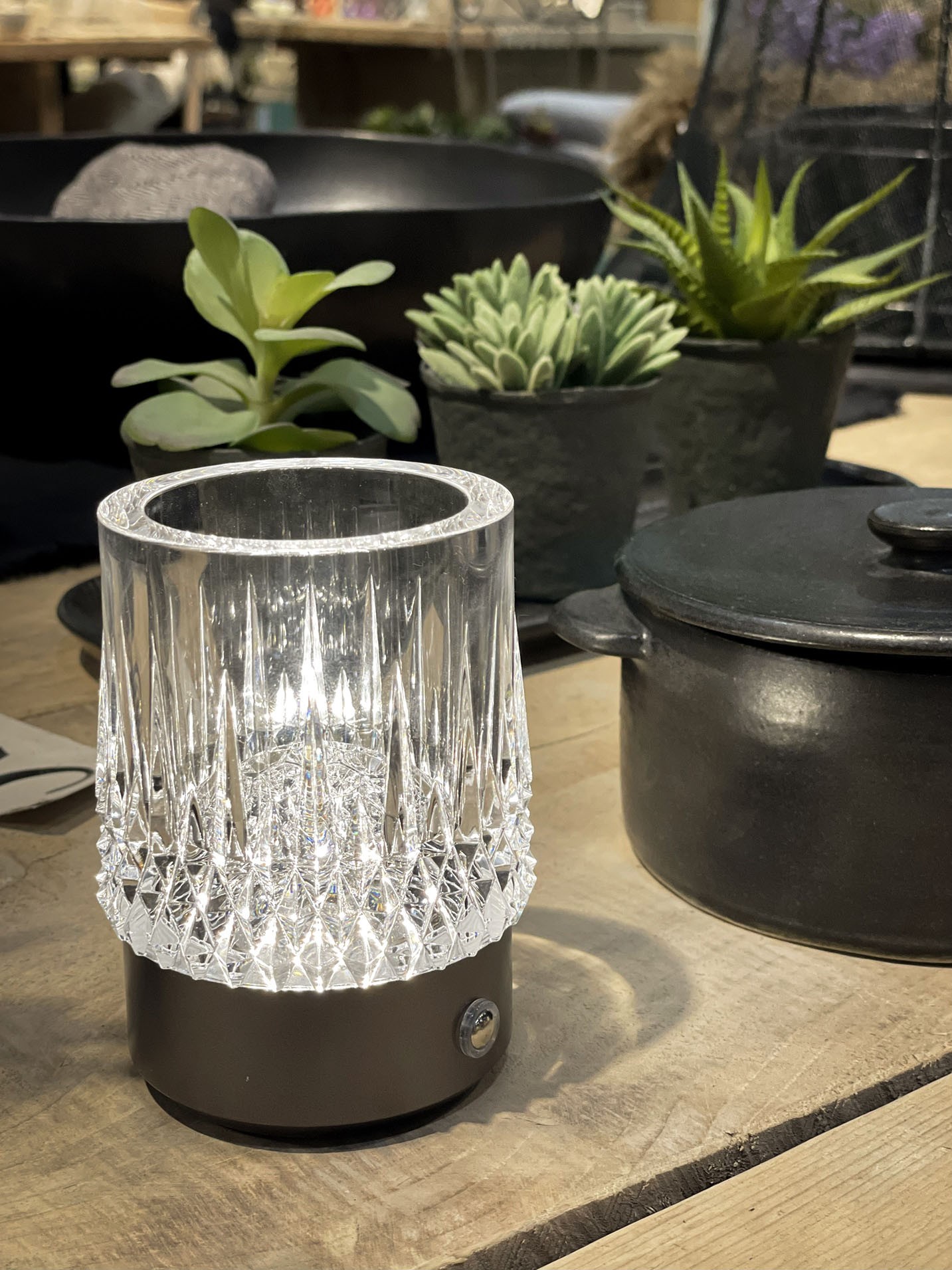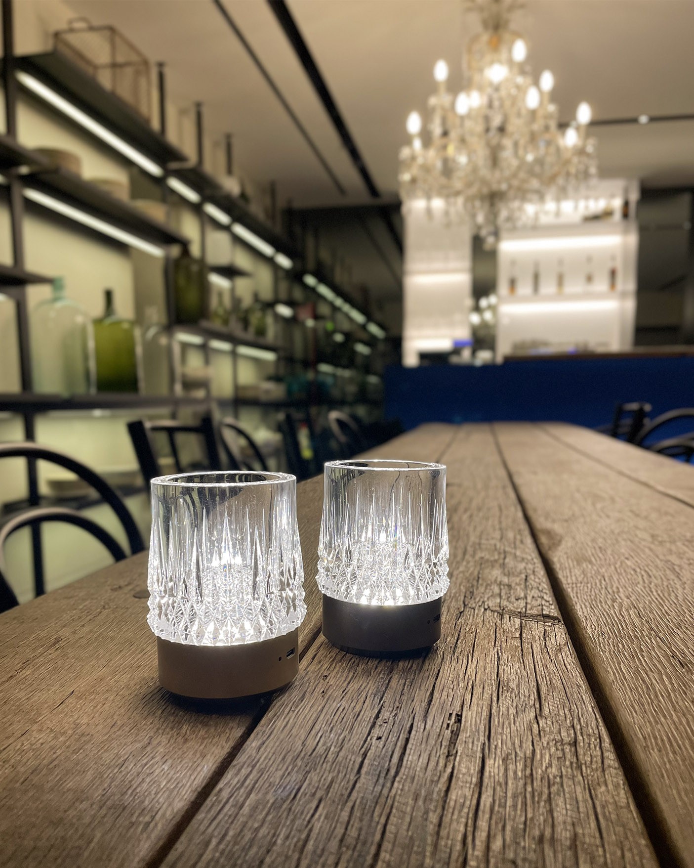 La crystal touch lamp è una lampada a led ricarica usb con cavetto incluso nella confezione. la parte superiore è in metacrilato trasparente effetto diamante. il metacrilato è un materiale plastico più trasparente del vetro, resistente ai raggi uv e riciclabile al 100%. la parte inferiore è in alluminio smaltato. diametro 7,5 cm , altezza 11 cm. si può spostare facilmente in quanto non necessita di fili per funzionare. si accende premendo il pulsante sulla base. ad ogni ulteriore tocco, l'intensità della luce diminuisce fino a spegnersi. la lampada presenta 3 diverse intensità di luce. con ricarica completa di 4 ore, la durata della luce a massima intensità è di 15 ore. la durata aumenta se vengono impostate le due intensità inferiori. durante la ricarica, un piccolo led rosso rimane acceso fino a quando la lampada non è completamente carica; a quel punto il led diventa verde. dona un tocco di classe grazie alla lavorazione elegante della parte diamantata. perfetta in moltissimi ambienti: interessante per i ristoranti e per i locali perchè crea atmosfera occupando pochissimo spazio. sui terrazzi e nei giardini crea magici punti luce. disponibile anche con la base smaltata in colore oro. imballo singolo in robusta scatola di cartone naturale che identifica facilmente il prodotto. l'illuminazione a led, consumando pochissima energia, è rispettosa dell'ambiente.