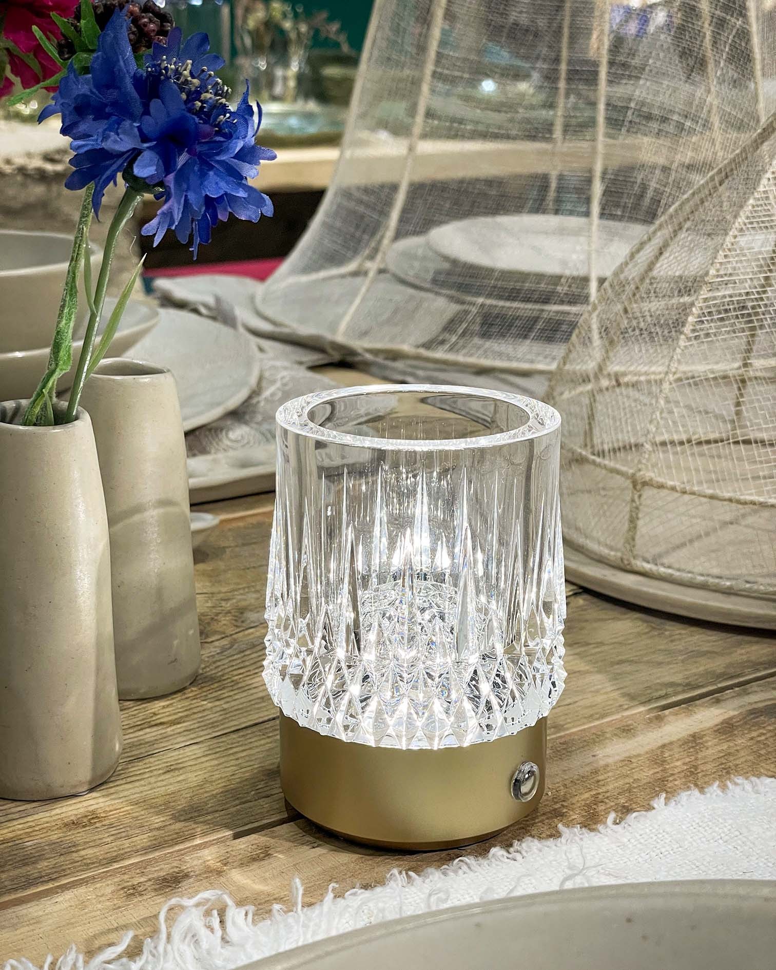 La crystal touch lamp è una lampada a led ricarica usb con cavetto incluso nella confezione. la parte superiore è in metacrilato trasparente effetto diamante. il metacrilato è un materiale plastico più trasparente del vetro, resistente ai raggi uv e riciclabile al 100%. la parte inferiore è in alluminio smaltato. diametro 7,5 cm , altezza 11 cm. si può spostare facilmente in quanto non necessita di fili per funzionare. si accende premendo il pulsante sulla base. ad ogni ulteriore tocco, l'intensità della luce diminuisce fino a spegnersi. la lampada presenta 3 diverse intensità di luce. con ricarica completa di 4 ore, la durata della luce a massima intensità è di 15 ore. la durata aumenta se vengono impostate le due intensità inferiori. durante la ricarica, un piccolo led rosso rimane acceso fino a quando la lampada non è completamente carica; a quel punto il led diventa verde. dona un tocco di classe grazie alla lavorazione elegante della parte diamantata. perfetta in moltissimi ambienti: interessante per i ristoranti e per i locali perchè crea atmosfera occupando pochissimo spazio. sui terrazzi e nei giardini crea magici punti luce. disponibile anche con la base smaltata in colore oro. imballo singolo in robusta scatola di cartone naturale che identifica facilmente il prodotto. l'illuminazione a led, consumando pochissima energia, è rispettosa dell'ambiente.