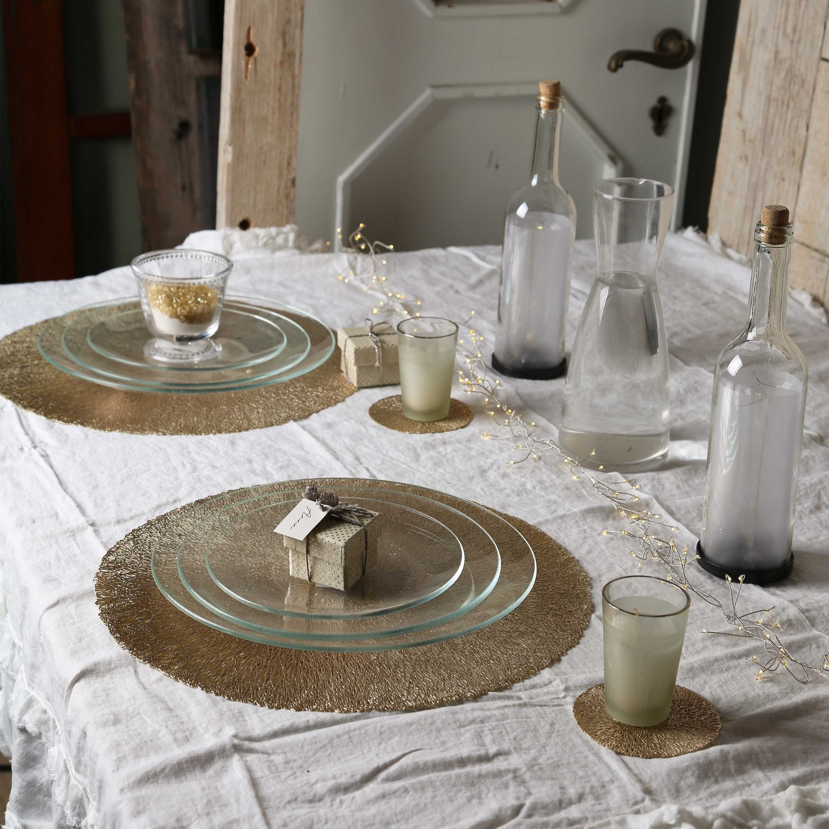 Coaster in woven pvc, gold color. practical and resistant material, easy to clean with a sponge or directly under water. sanitizable. the coasters are waterproof and non-slip. easily stockable, they take up very little space. elegant and bright line. perfect not only for christmas parties, but also for parties, ceremonies, weddings, events, etc. available in seven colors: gold, silver, turquoise, red, green, chocolate and black. can be combined with the relative underplate (tsto673) and with our methacrylate spiral glasses.