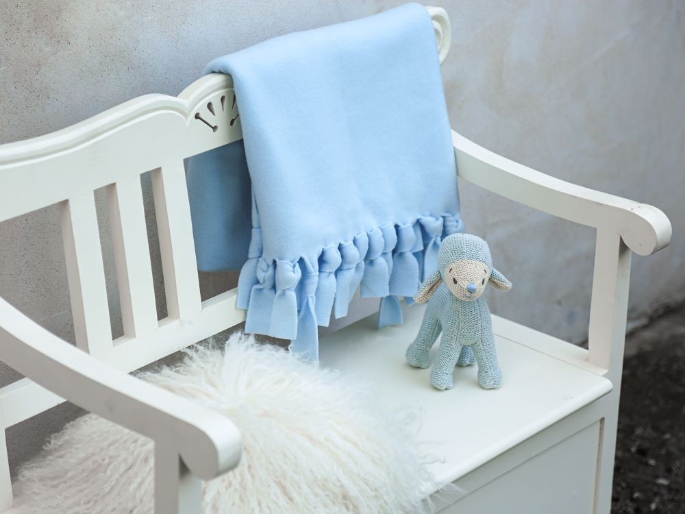 Light-blue hand-made knitted sheep with rattle. perfect as a party favor or as a gift for a child. available in pink.