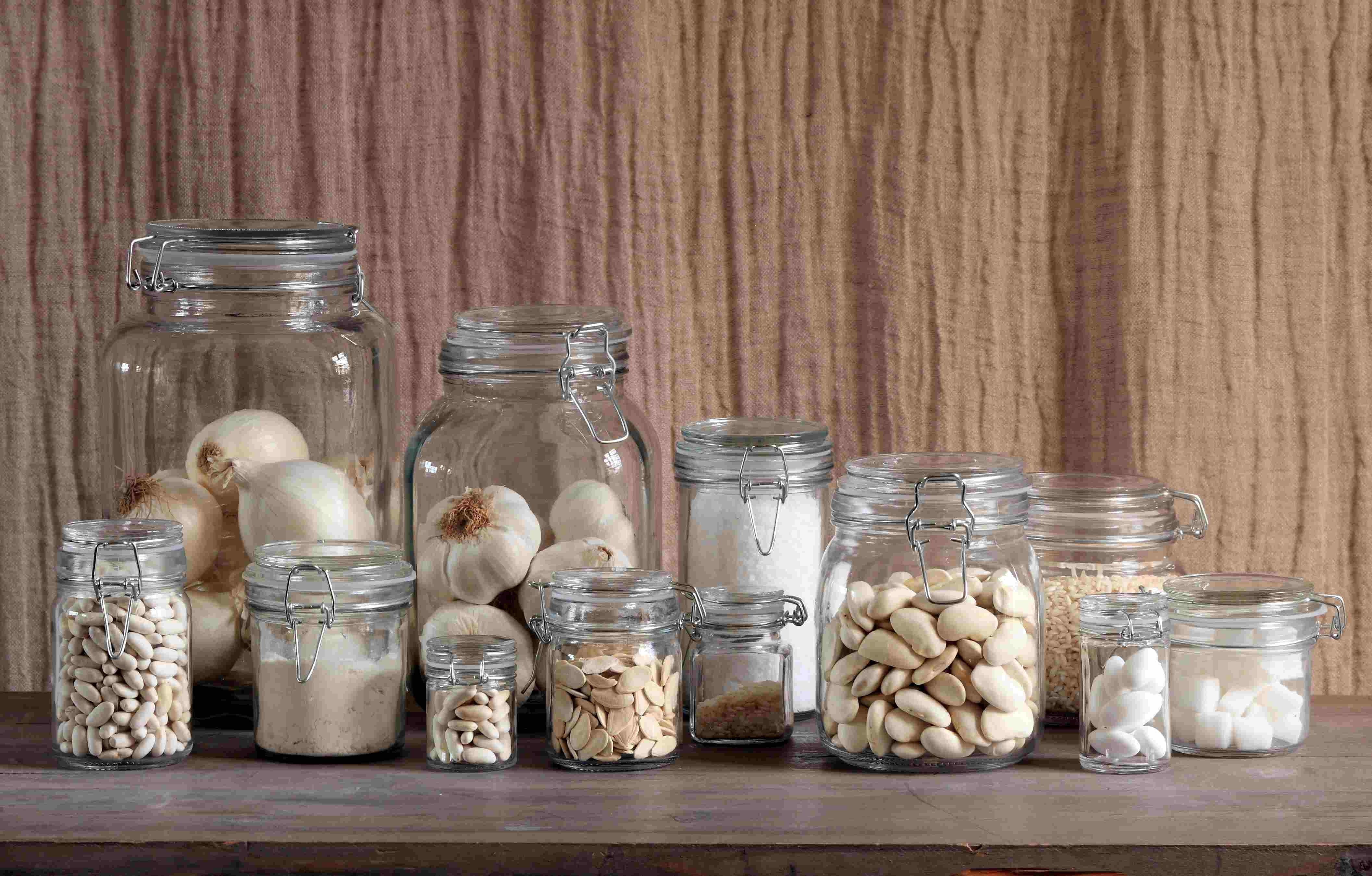 Transparent glass jar with a simple and clean look, with an elegantly neutral colored rubber seal. airtight metal clip closure. for food use. glass is the best material for storing food as it does not alter flavors and aromas, and does not release any type of substance (important for our health). the airtight lid allows you to preserve the organoleptic qualities of the contents. the uses of the jars with clips are numerous. they can store food in a protected, hygienic and safe way. the larger sizes are very suitable for buffets, to contain cereals, dried fruit, etc. the smaller size clip cans can be used to offer single portions. they can form the packaging of a gift by inserting sweets, chocolates, etc. inside. the smaller clip jars can act as packages for jewels, scarves and sugared almonds, turning into practical and healthy favours. they can be used as lanterns simply by inserting a candle inside them. even in the use of terrarium construction, they can be containers suitable for creating small self-sufficient gardens. it should also be emphasized that their transparency offers the convenience of having everything in view.