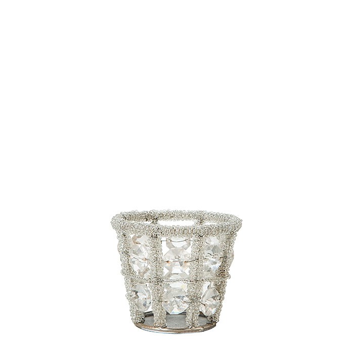 Preciously decorated brilliant glass, d.5 cm and h.6.5 cm. the glass is adorned with several small diamonds that set its surface, while still allowing to see inside. it can be used both as a tealight holder and as a vase for small floral arrangements.