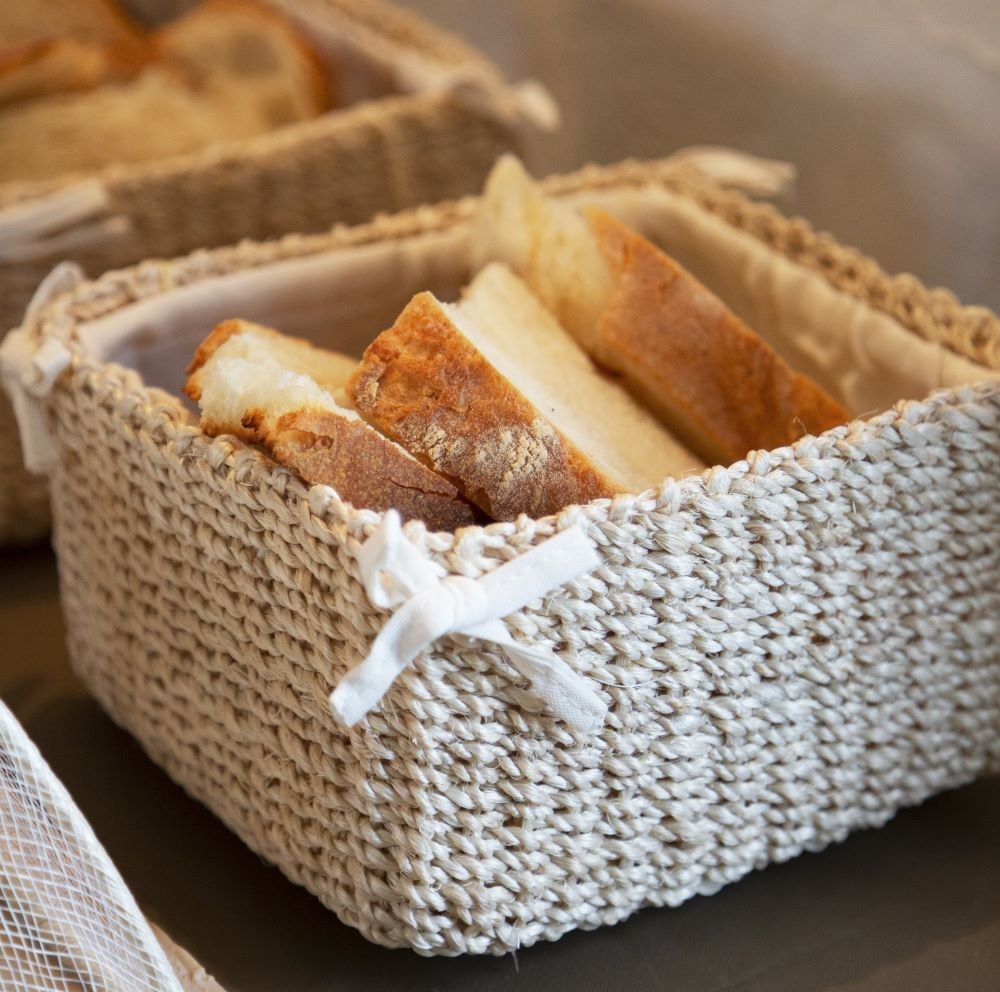 Set of 2 baskets in natural abaca with lining and bows in the corners, handmade. abaca is a 100% vegetable material, obtained from the musa textilis plant. it is therefore 100% natural, ecological and biodegradable. precious and refined baskets. multifunctional product: it is ideal for containing breadsticks, bread, or small objects. removable and machine washable cover. the abaca part can be cleaned with a damp sponge or with a dry stain remover. available in 3 colors: white, linen and black.