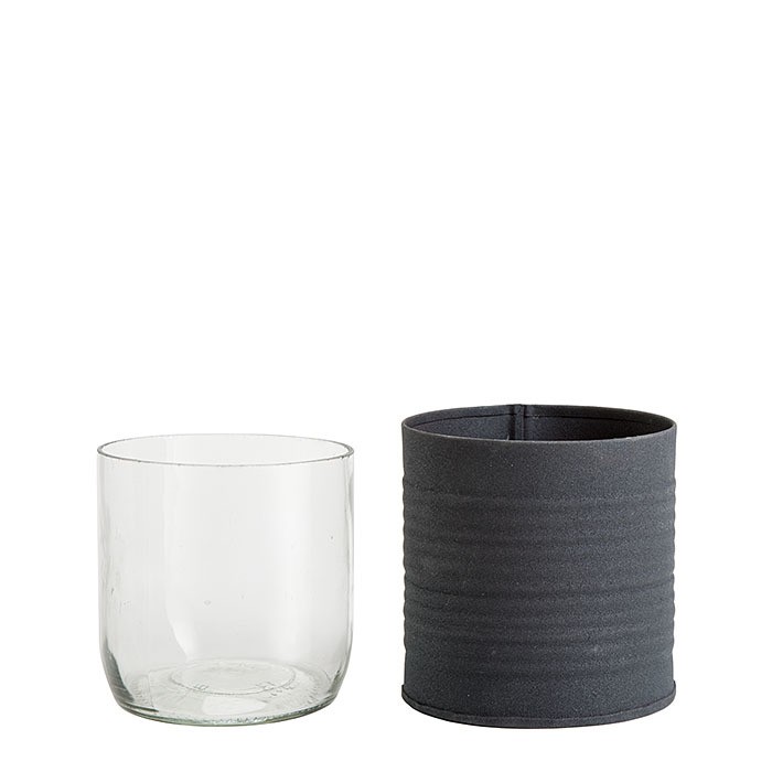 Dark matt tin jar with horizontal stripes and glass d8 h8 cm