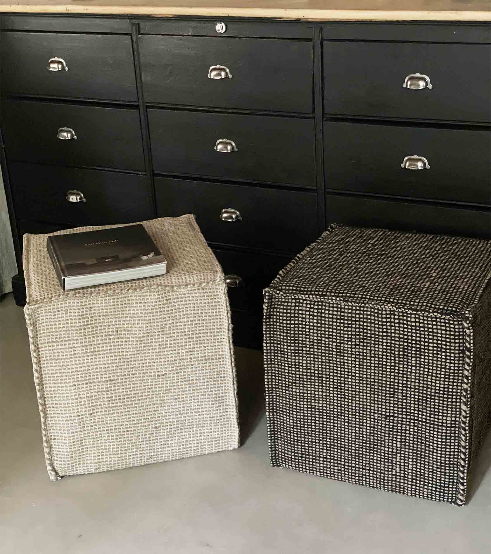 Handmade product in jute and cotton. its cube shape and reversed edge stitching give the product an essential and modern look, allowing it to adapt to a wide range of environments. multifunctional product: ideal as a seat, as a footrest, as a bag rest or as a side table. useful because it is light and easily transportable. available in two colors: natural with clear stitching and black with natural stitching.