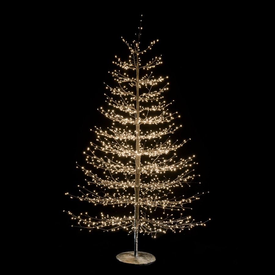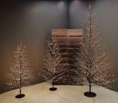 Black stick tree with 6590 integrated LED lights with very low energy consumption. Height 300 cm, diameter 170 cm. Suitable for indoors and outdoors even in rain and snow (GS IP 44 waterproof). Equipped with a black round iron base. Decoration with a minimal and modern design with a great scenic effect, does not require decorations. It can be used as a Christmas tree. Placed near windows and glass walls it reflects its magic doubling the scenic effect. It lights up completely by inserting the plug into the power socket. The tree is delivered in a cardboard box that takes up very little space and is easy to store. Length of the electric cable 5 m.