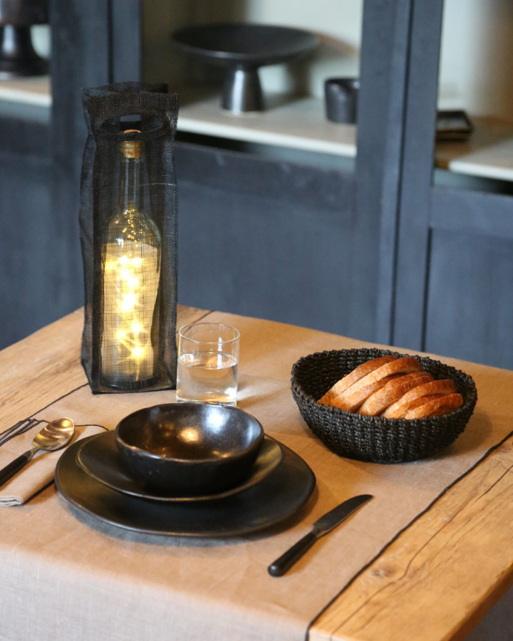 Black abaca net bottle holder with handles 10 x 10 h31 cm