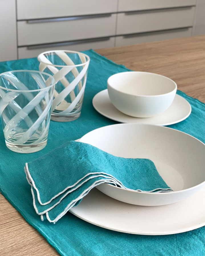 Transparent glass with solid cream colored spiral, made of TOP QUALITY bio-copoliestere, resistant to UV rays and 100% recyclable. Compatible with suncreams. The material used gives these glasses lightness and practicality, resistant to shocks and suitable for food use. They are ideal for outdoor use for: picnics, barbecues, boat parties, birthdays, anniversaries, garden parties, outdoor lunches or dinners. For practical purposes the glasses in methacrylate are a very valid solution as single-use plastic will be prohibited and glass, in the event of breakage, is dangerous in places like, swimming pools, wellness areas and public events. Our collections are also highly appreciated for the modern and refined aesthetics that characterize them. Dishwasher safe using a neutral detergent, at a maximum temperature of 60 degrees, on the top shelf of the machine. Dry with a soft cloth after washing. Do not use abrasive sponges. Available in 11 elegant versions: with FULL SPIRAL in the following colours: cream, green and brown and with TRANSPARENT SPIRAL in the following colours: green, cyclamen, mustard, black, rust, white, turquoise and blue. Also available is a set consisting of 6 cheerful assorted colors, with a full spiral: yellow, orange, pink, purple, blue and green. Designed to be perfectly combined with our collections of vinyl tablecloths, pvc underplates, 100% linen napkins with colored border and abaca. Nominal capacity: 450 ml