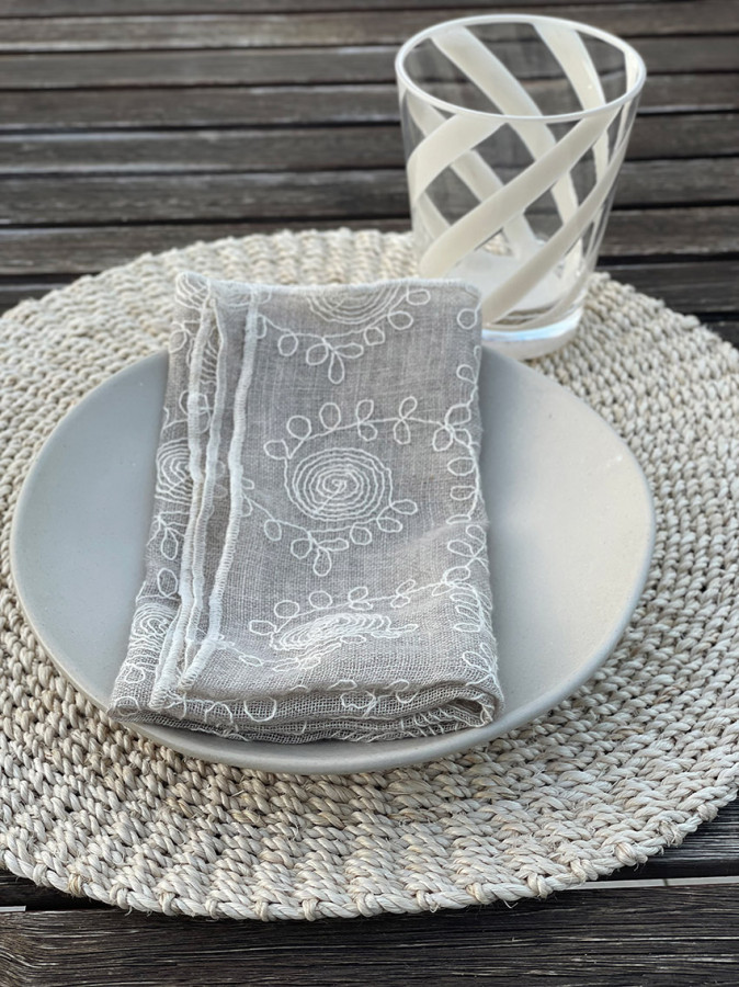 Elegante tovagliolo in 100% lino garzato con ricami colore panna e bordo a contrasto ricamato a pieno. Morbido al tatto e facilmente abbinabile alle nostre tovaglie e ai runner, per un effetto raffinato. Il lino è la più antica e pregiata fibra vegetale, ed è una delle più resistenti al mondo. Assicura una sensazione di freschezza a contatto con la pelle. E' una fibra 100% NATURALE perchè deriva dalla pianta Linum Usitatissimum. E' un prodotto ECO FRIENDLY perché la sua coltivazione non necessita di pesticidi e necessita di poca acqua. Inoltre è 100% BIODEGRADABILE e 100% RICICLABILE. Se di qualità si riconosce con uno sguardo e risulta bello sia alla vista che al tatto. E' anallergico e antibatterico. Tessuto prelavato, non si restringe. Lavabile in lavatrice a 40°, e non necessita di stiratura.