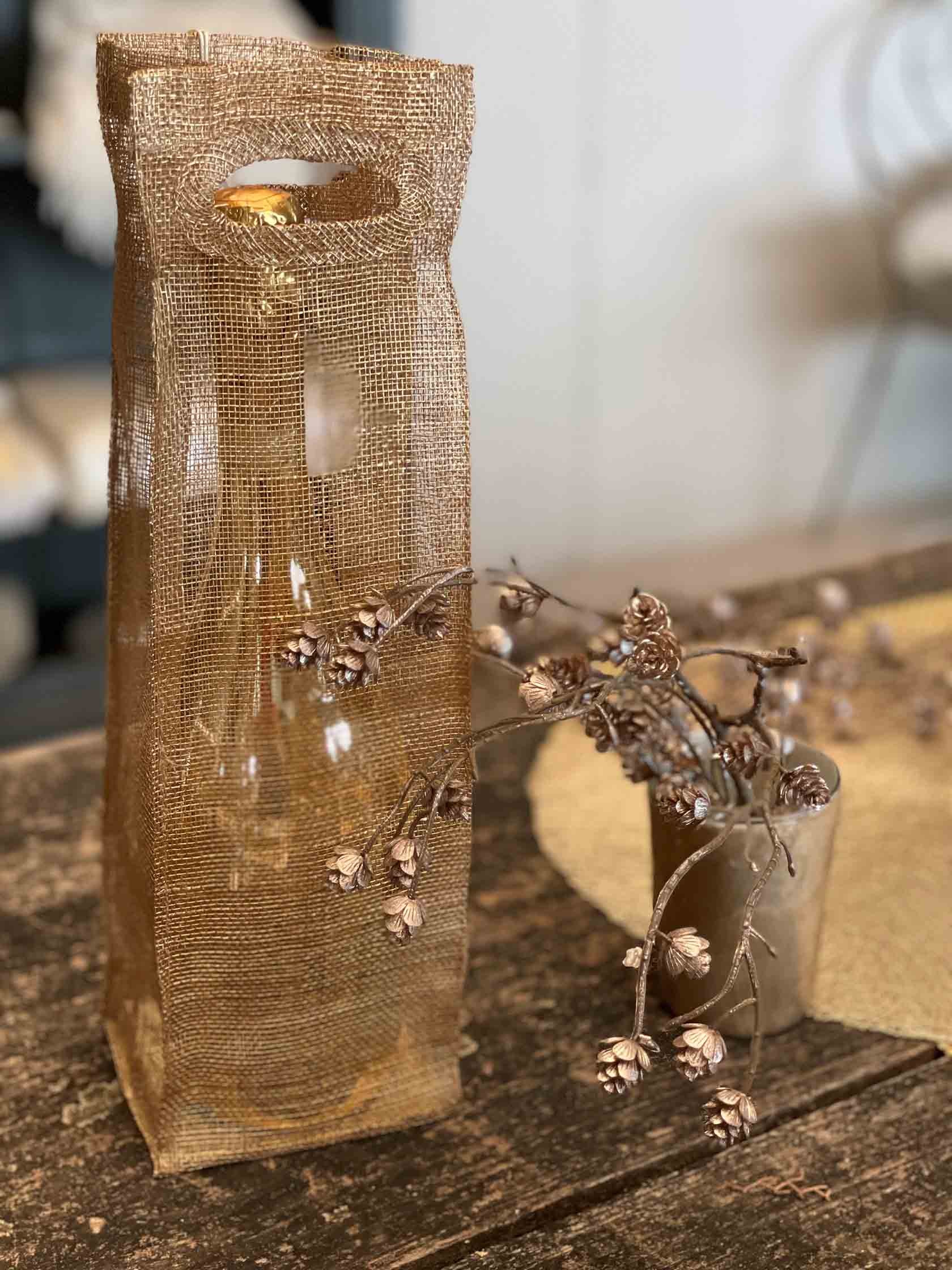 Porte-bouteille en filet d'abaca avec poignees et trou couleur or 10 x 10 h31 cm