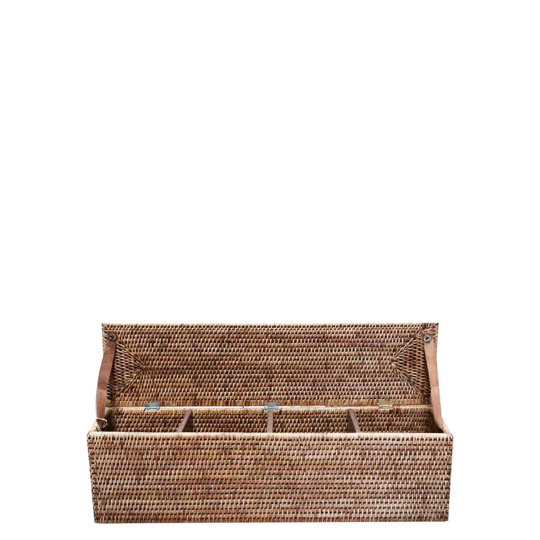 Boite vintage en oisier avec 4 compartements et couvercle 60x15 h16 cm