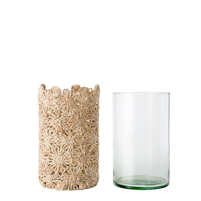 Cachepot panier en abaca fleurs + verre couleur creme d17 h27 cm
