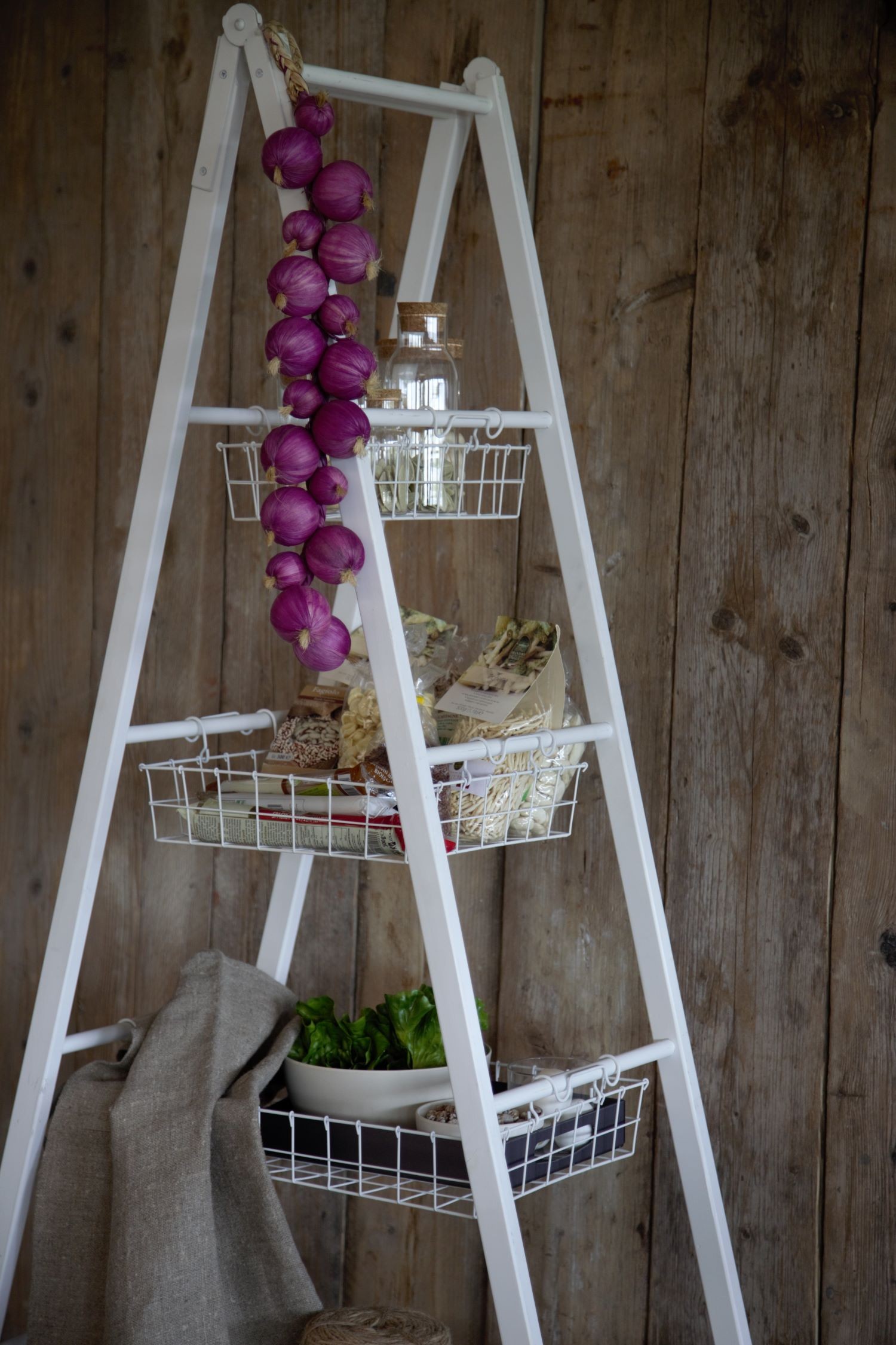 Echelle d'exposition en bois blanc avec 4 paniers en fer fonce 100 x 41 h188 cm
