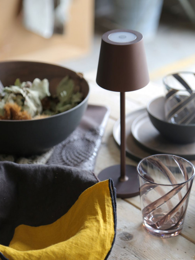 "Luci-lla", lampe sans fil élégante de haute qualité qui, grâce à cette liberté, peut être placée n'importe où. La protection IP54 permet l'utilisation de la lampe aussi bien à l'intérieur qu'à l'extérieur. Parfait comme lampe d'intérieur et d'extérieur pour éclairer un dîner romantique dans le jardin, sur la terrasse, sur un bateau, etc. Il a une hauteur visant à ne pas obstruer la vue entre les convives. Lampe tactile (s'allume avec une touche sur la partie supérieure) en aluminium peint, rechargeable par USB, dimmable (cela signifie qu'il est possible de régler l'intensité de la lumière en touchant la partie supérieure de la lampe avec un doigt). Avec lumière LED (faible consommation d'énergie). Autonomie de la batterie : min 10 - max 30 heures, selon l'intensité de la lumière avec laquelle elle est utilisée. Temps de charge : 5/6 heures. Existe aussi en blanc, noir, chocolat, crème, or. Fil de charge inclus dans chaque boîte. Emballage unique. Pour les quantités supérieures à 18 pièces, il y a une réduction.