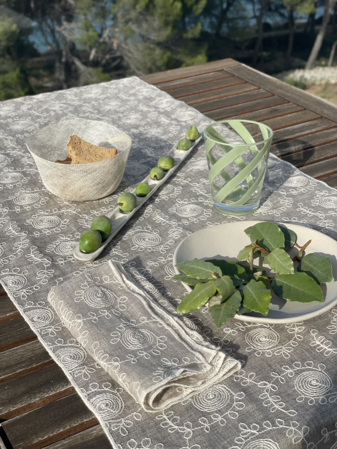 Elegante runner in 100% lino garzato con ricami colore panna e bordo a contrasto ricamato a pieno. Morbido al tatto e facilmente abbinabile ai nostri tovaglioli, per un effetto raffinato. Il lino è la più antica e pregiata fibra vegetale, ed è una delle più resistenti al mondo. Assicura una sensazione di freschezza a contatto con la pelle. E' una fibra 100% NATURALE perchè deriva dalla pianta Linum Usitatissimum. E' un prodotto ECO FRIENDLY perché la sua coltivazione non necessita di pesticidi e necessita di poca acqua. Inoltre è 100% BIODEGRADABILE e 100% RICICLABILE. Se di qualità si riconosce con uno sguardo e risulta bello sia alla vista che al tatto. E' anallergico e antibatterico. Tessuto prelavato, non si restringe. Lavabile in lavatrice a 40°, e non necessita di stiratura.