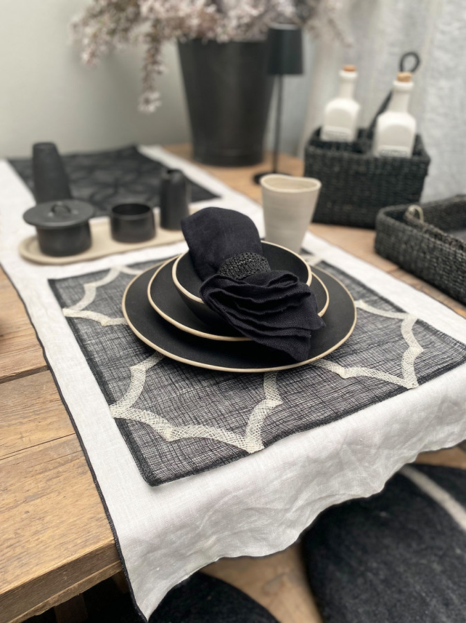 Sottopiatto quadrato in abaca colore nero con prezioso e raffinato motivo bianco. Handmade. L'abaca è un materiale 100% vegetale, ricavato dalla pianta Musa Textilis. à quindi 100% naturale, ecologico e biodegradabile. Si può pulire con una spugna umida oppure con uno smacchiatore a secco.
